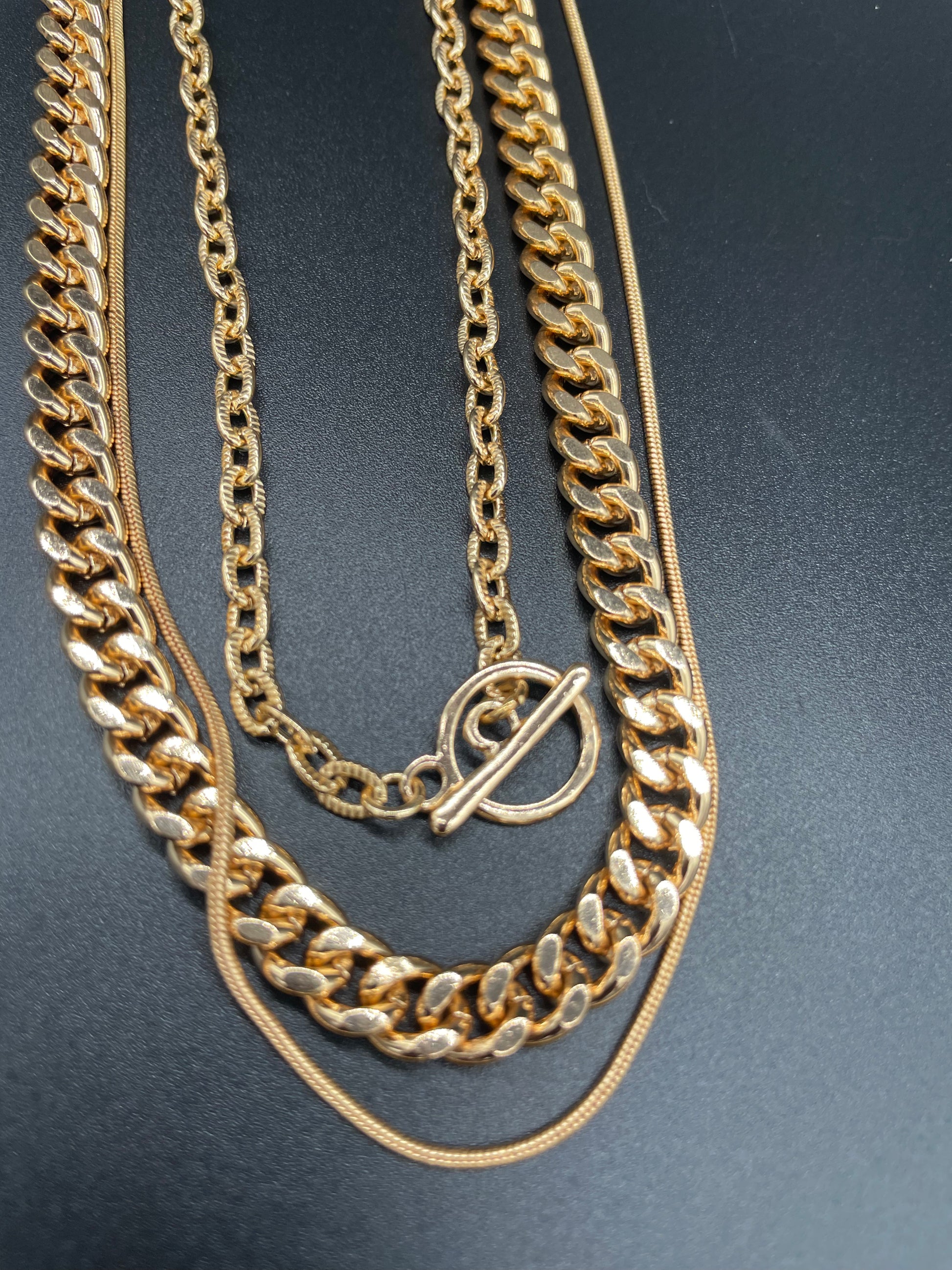 Bold and versatile, our 3 strand layering gold chains add a touch of luxury and sophistication to any outfit. Perfect for layering or wearing on its own, these chains are the ultimate statement piece. Elevate your style with these stunning and timeless accessories.