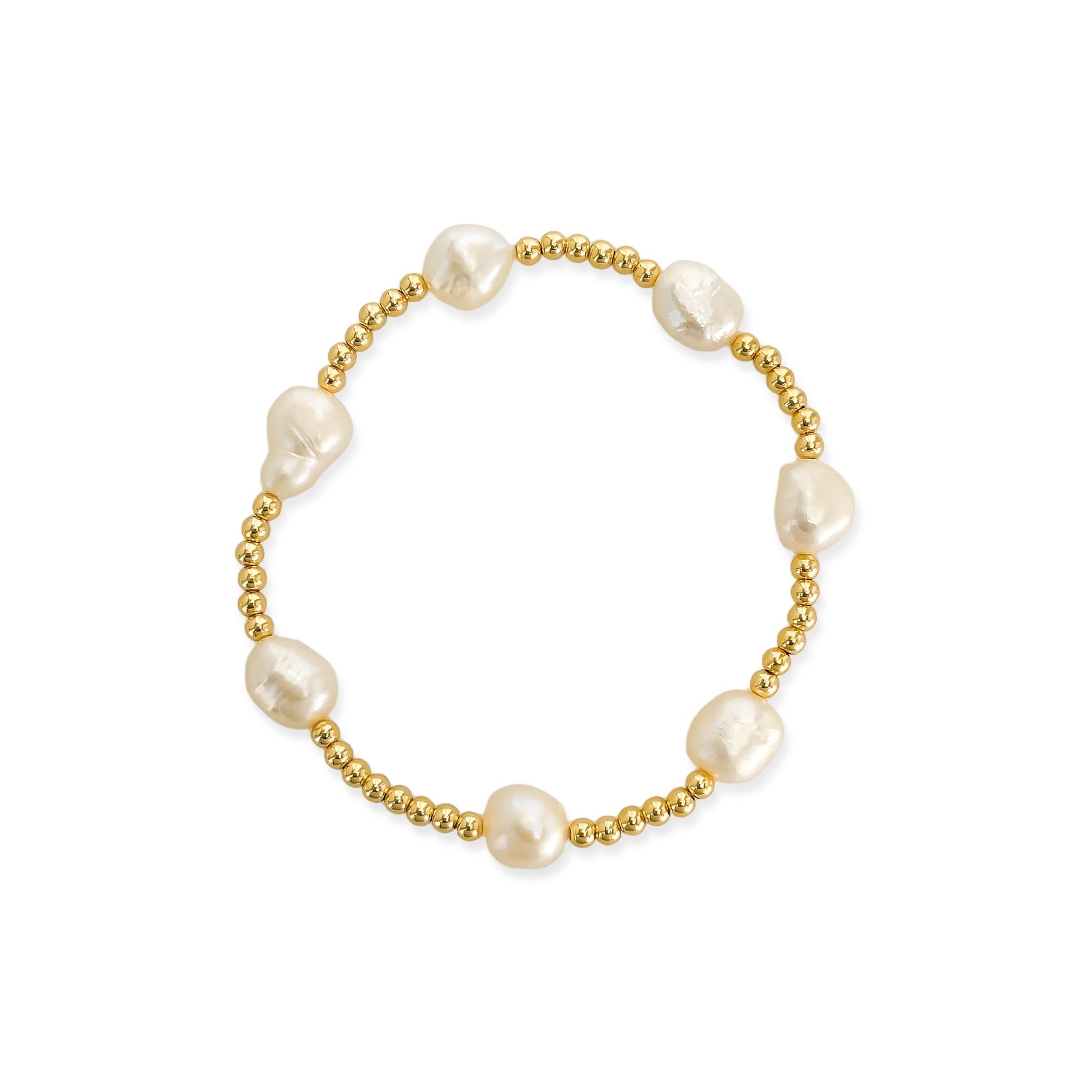Add a touch of sophistication with our Baroque Freshwater Pearl Bracelet. The 14 karat gold and triple-plated stainless steel beads, measuring 3 mm, create a luxurious look. The stretch design ensures a comfortable fit, while the unique shapes and sizes of the freshwater pearls add a touch of elegance and simplicity.