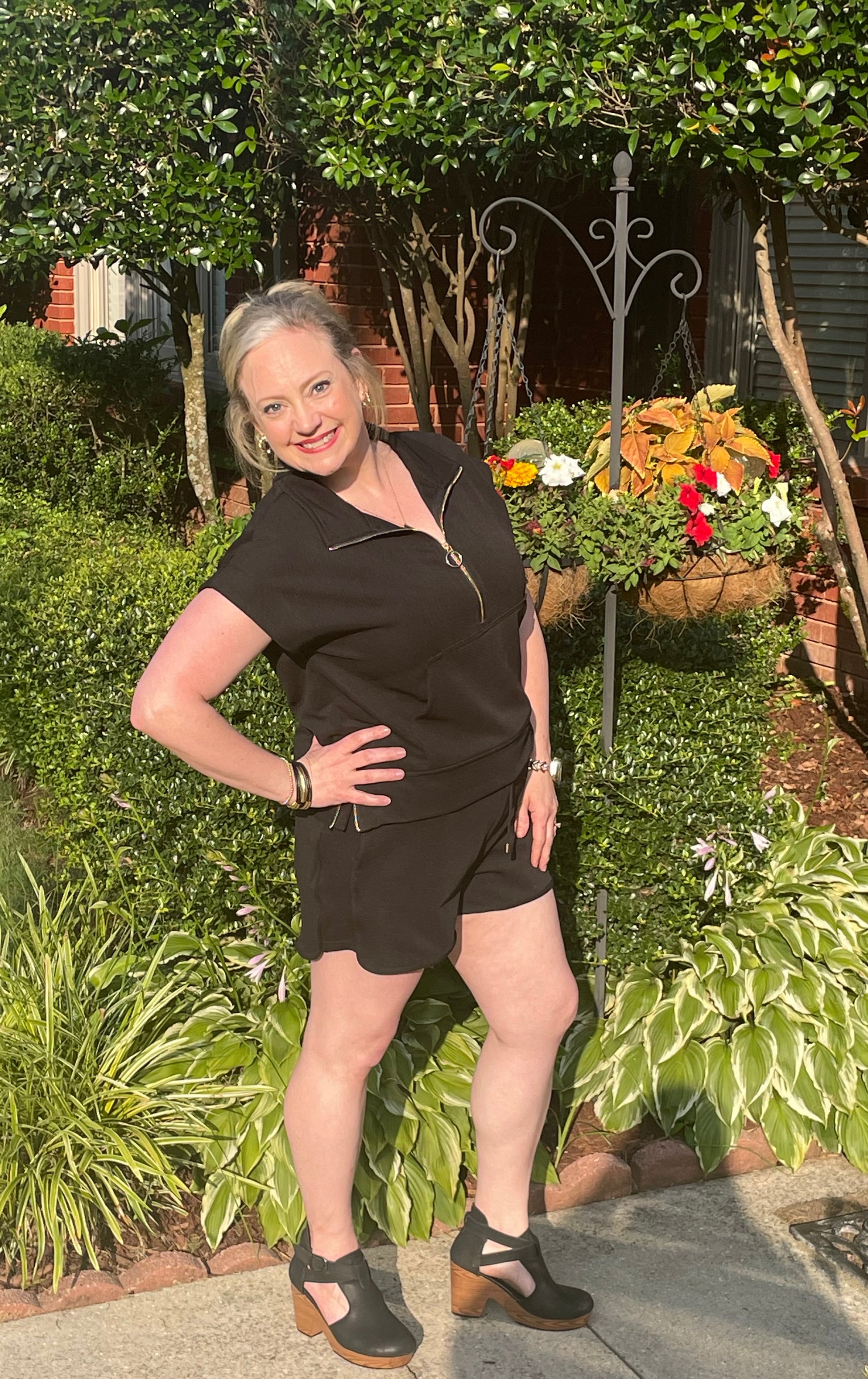 Enhance your travel style with our Black Textured Travel Set. This must-have set features a trendy ribbed texture, gold zippers, and a cute short sleeve half zip top with a kangaroo pocket and zip up detail. Lightweight, it's the perfect companion for your summer travels. ( sizing is generous )