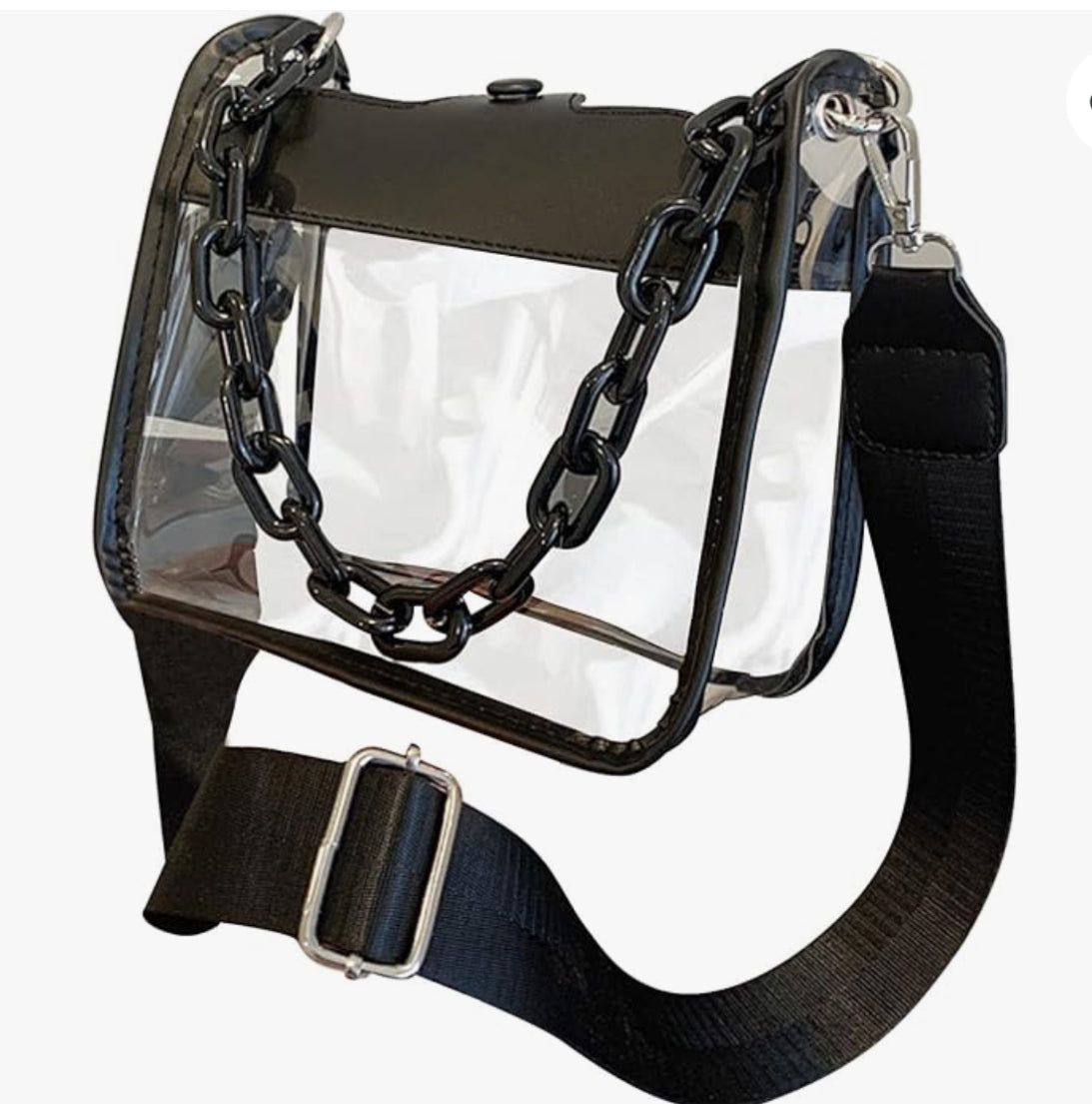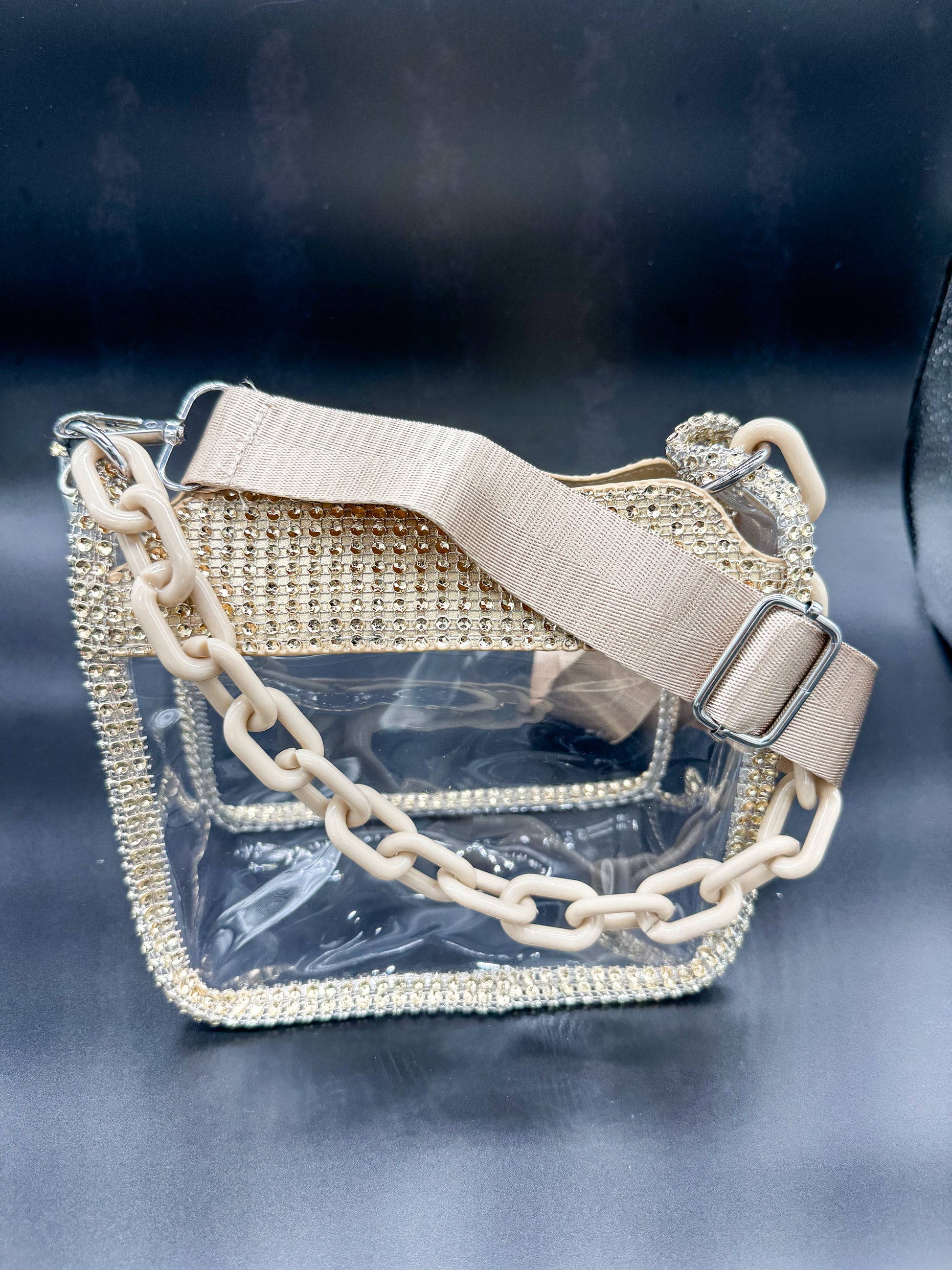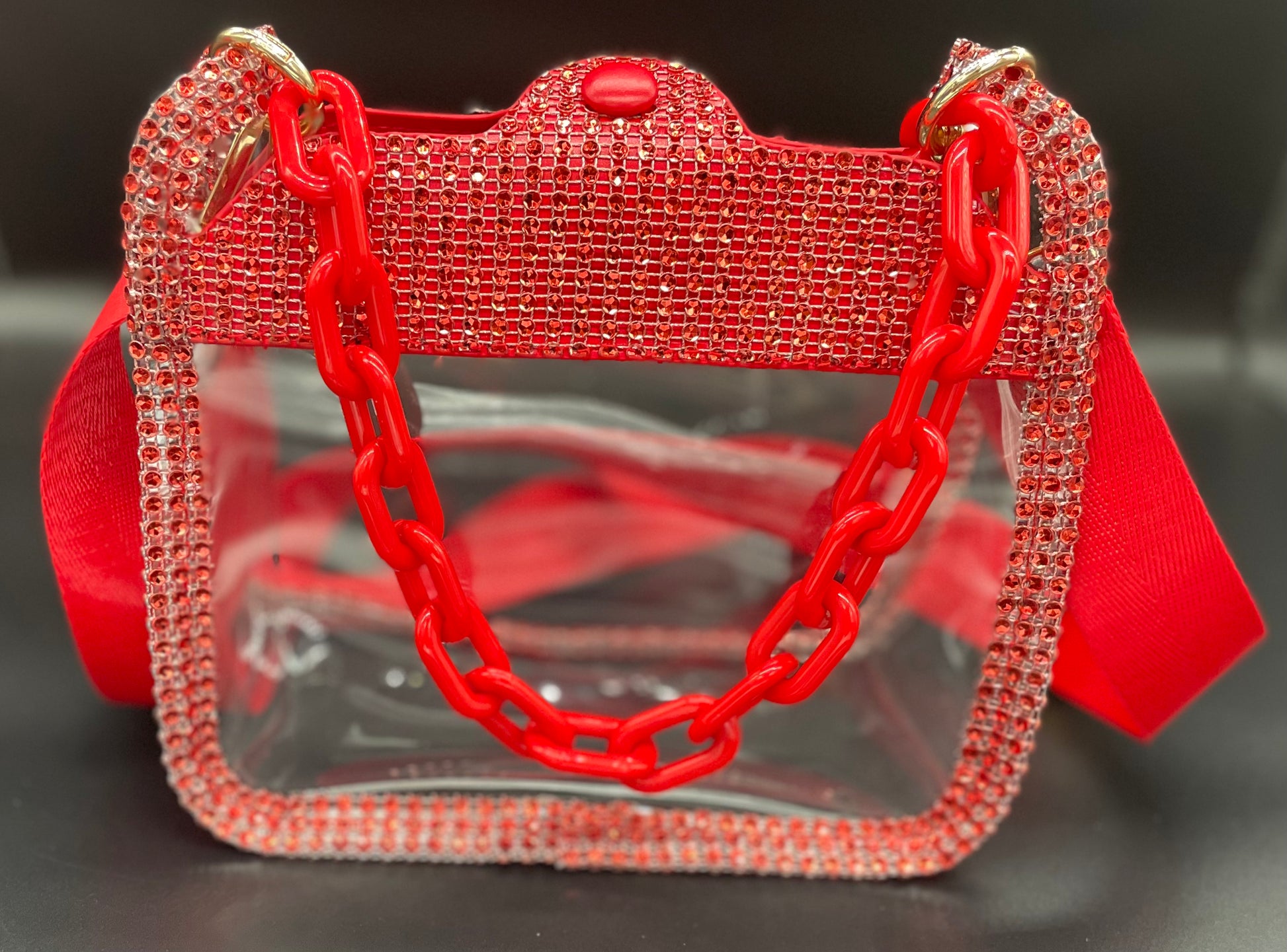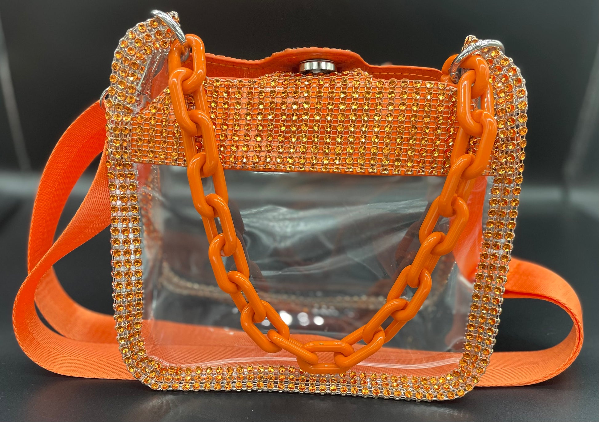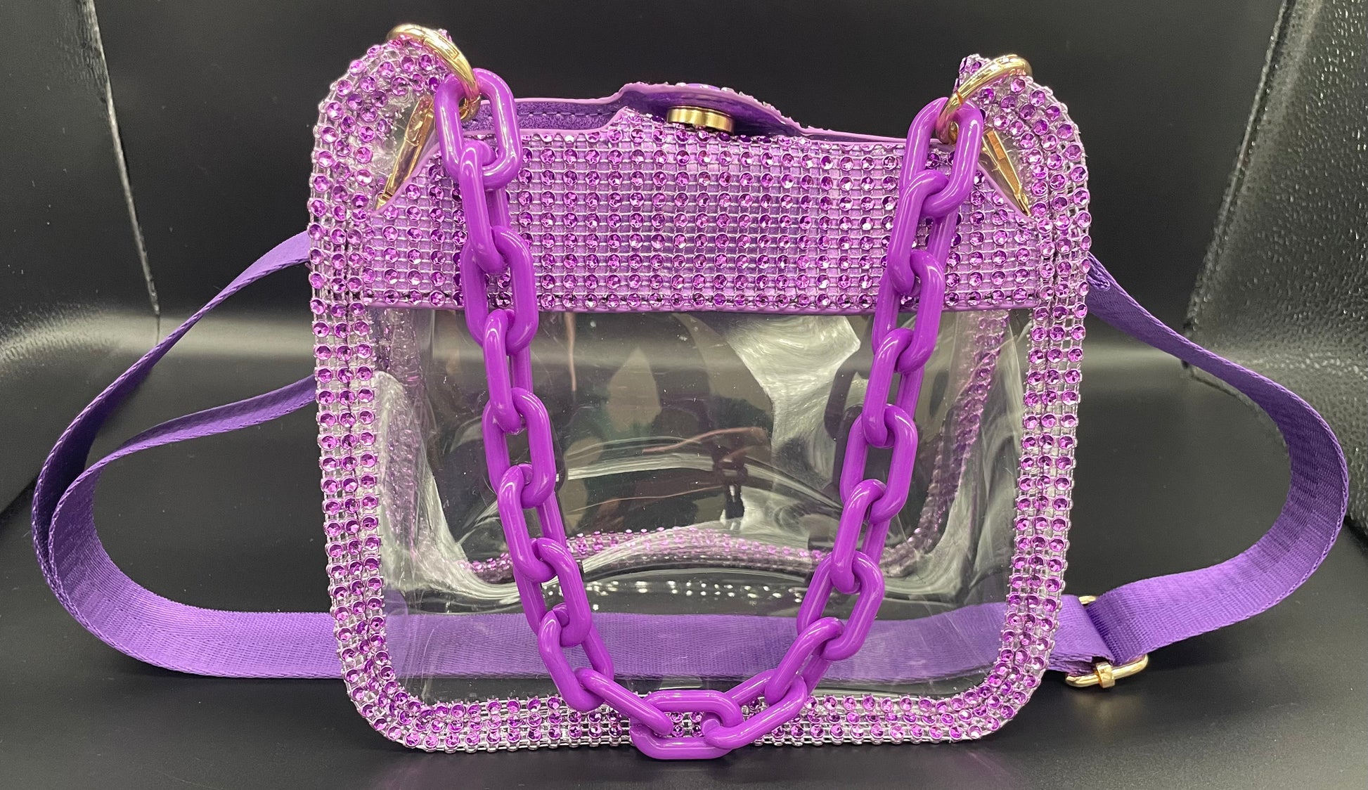 This stunning clear bag features a glamorous twist with delicate rhinestone detailing. Whether you choose the long crossbody strap or the acrylic chain handbag strap, this versatile and stylish bag is perfect for gamedays. With its stadium regulation size, you'll breeze through security and elevate your game-day look effortlessly.