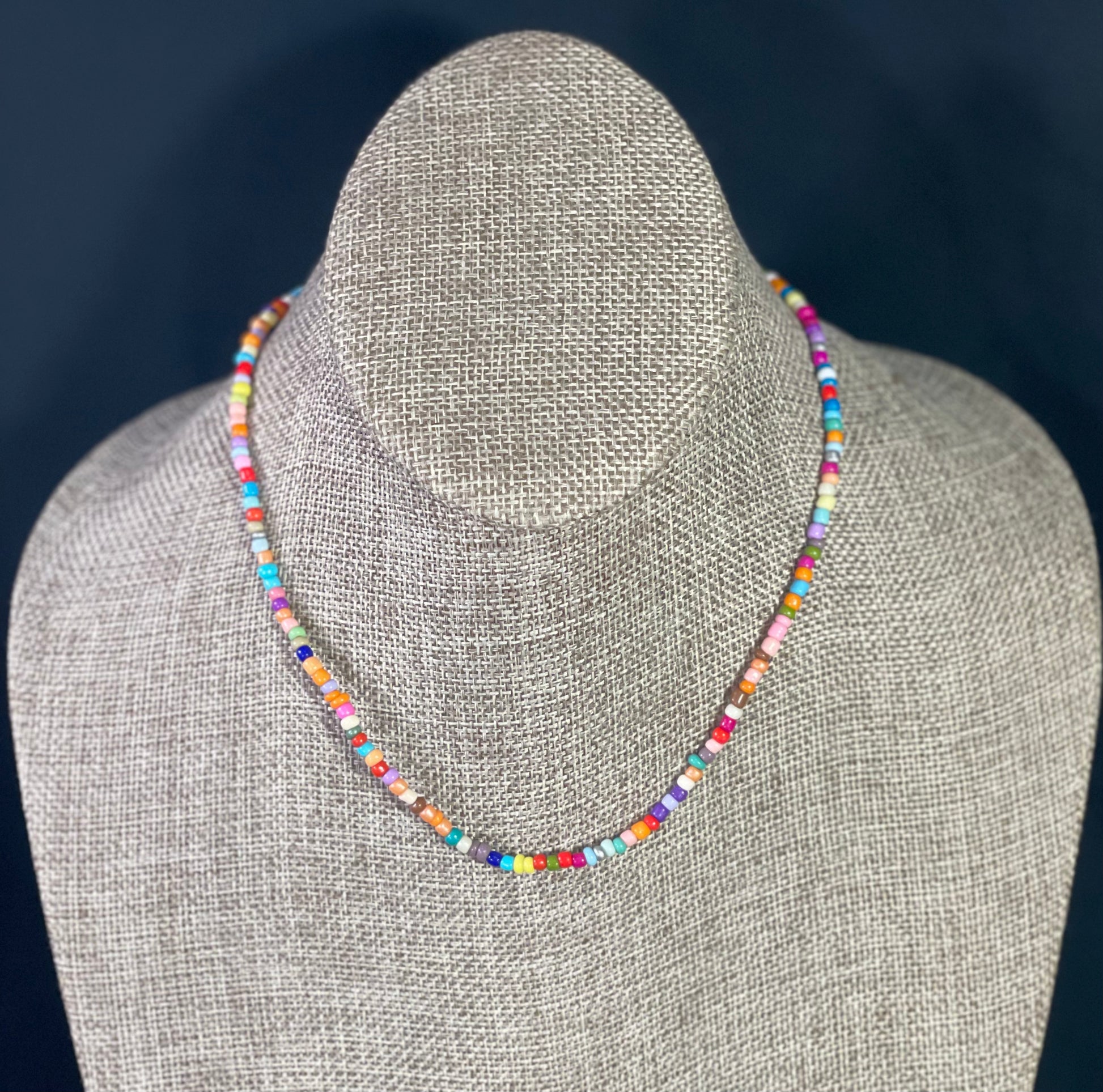 "Add a pop of color and a touch of fun to your look with this colorful beaded necklace. Perfect for channeling those surfer girl vibes, this necklace will have you feeling like a playful mermaid (in the best way possible!) Don't miss out on this statement piece!