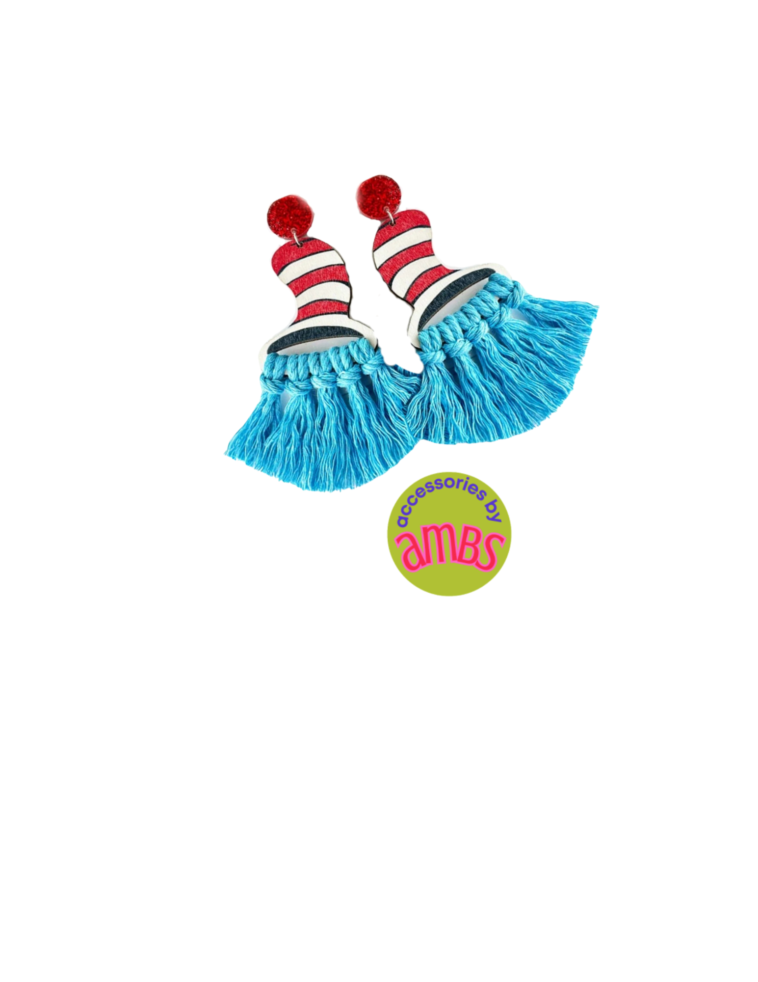 Step up your fashion game with a whimsical touch by donning these Dr. Seuss Top Hat Fringe earrings. Not only will you stand out with their unique design, but you'll also be supporting a good cause - a portion of the proceeds goes to Trussville Children's Theater. Make a statement and make a difference with these playful earrings.