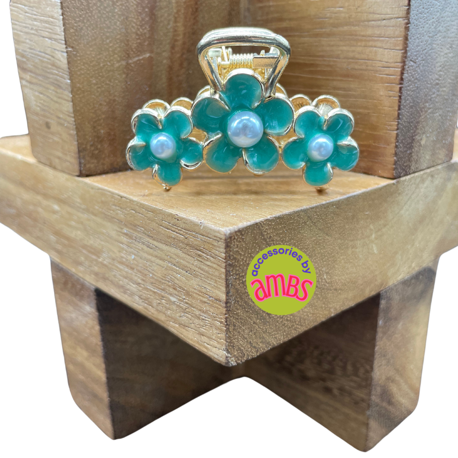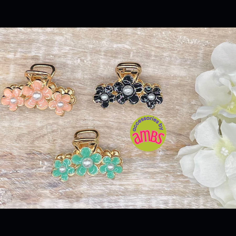 Enhance your hairstyle with our luxe Flowers and Pearls Hairclip. Made of gold and adorned with your choice of jade, baby pink, or black pearlized flowers, each with a stunning pearl center. Add a touch of sophistication and elegance to any look.