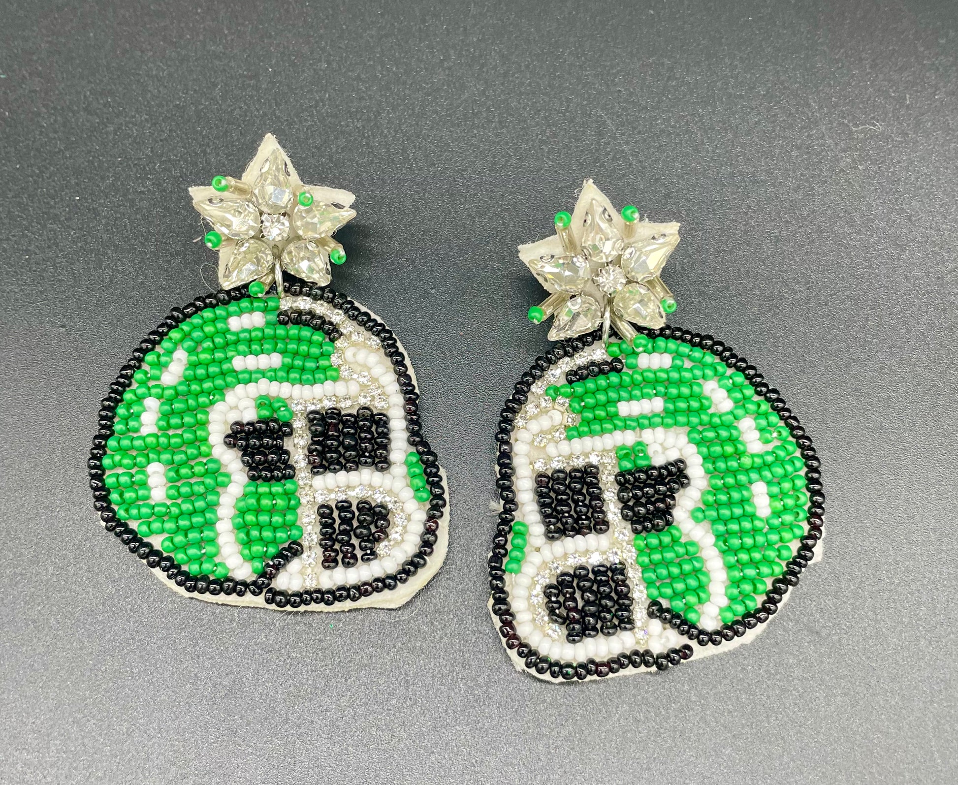 Score a touchdown in style with our Green Football Helmet Earrings! Featuring seed beads and rhinestones, these game day accessories add a touch of glam to any outfit. Perfect for the football fanatic who loves to stand out!