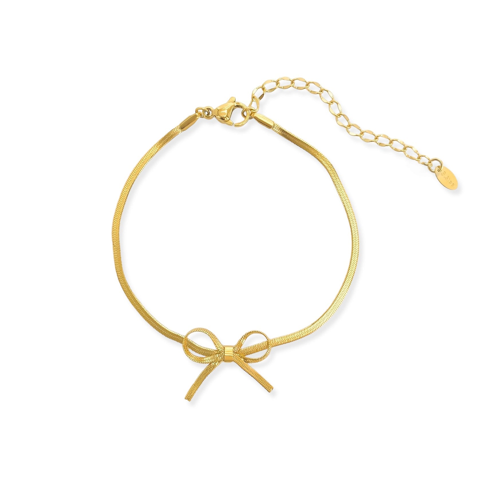 Indulge in luxury with our Herringbone Ribbon Bracelet. This elegant piece features a water-resistant design and stunning herringbone pattern adorned with delicate ribbon detail. It's crafted with gold triple-plated stainless steel, making it both stylish and durable. With a lobster clasp and 2 inch extension, it's the perfect size for any wrist. Add a touch of sophistication to any outfit with this timeless bracelet.