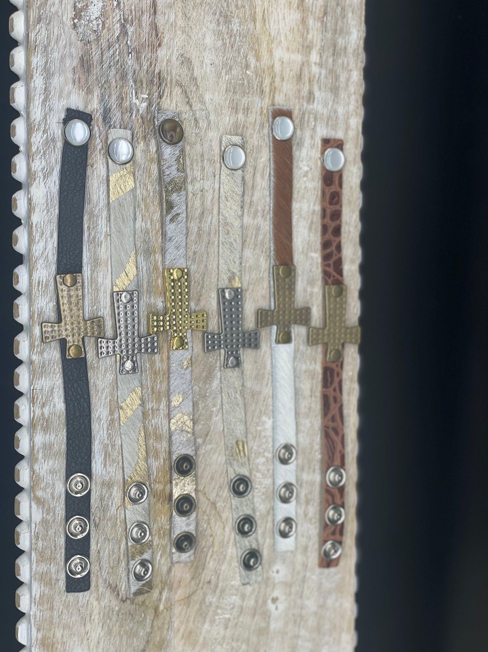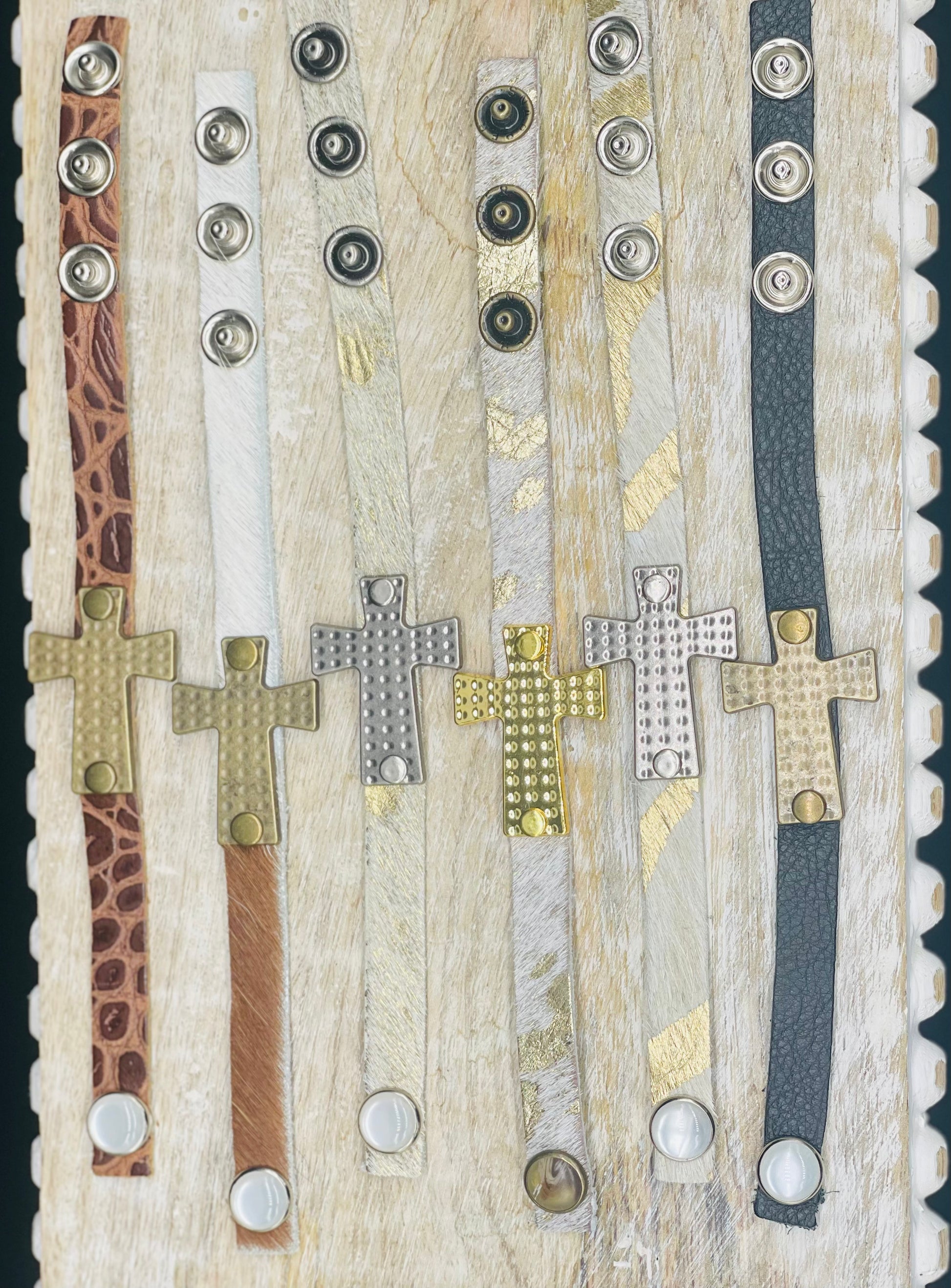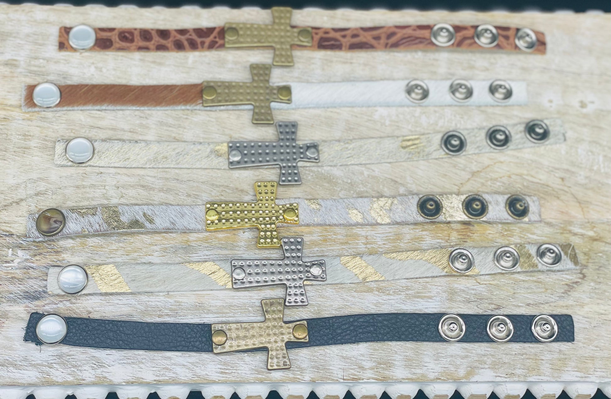 Add a touch of western chic to your outfit with our Leather Mini Cuff with Hammered Cross. Made with genuine leather and a beautiful pearl snap closure, this adjustable bracelet is both stylish and classic. Perfect for any cowgirl looking to elevate her style.