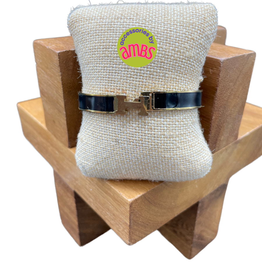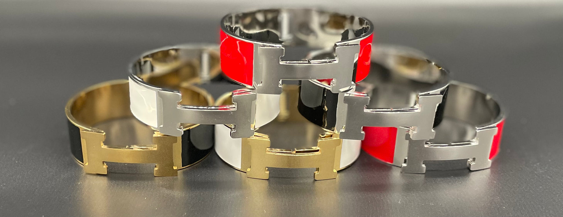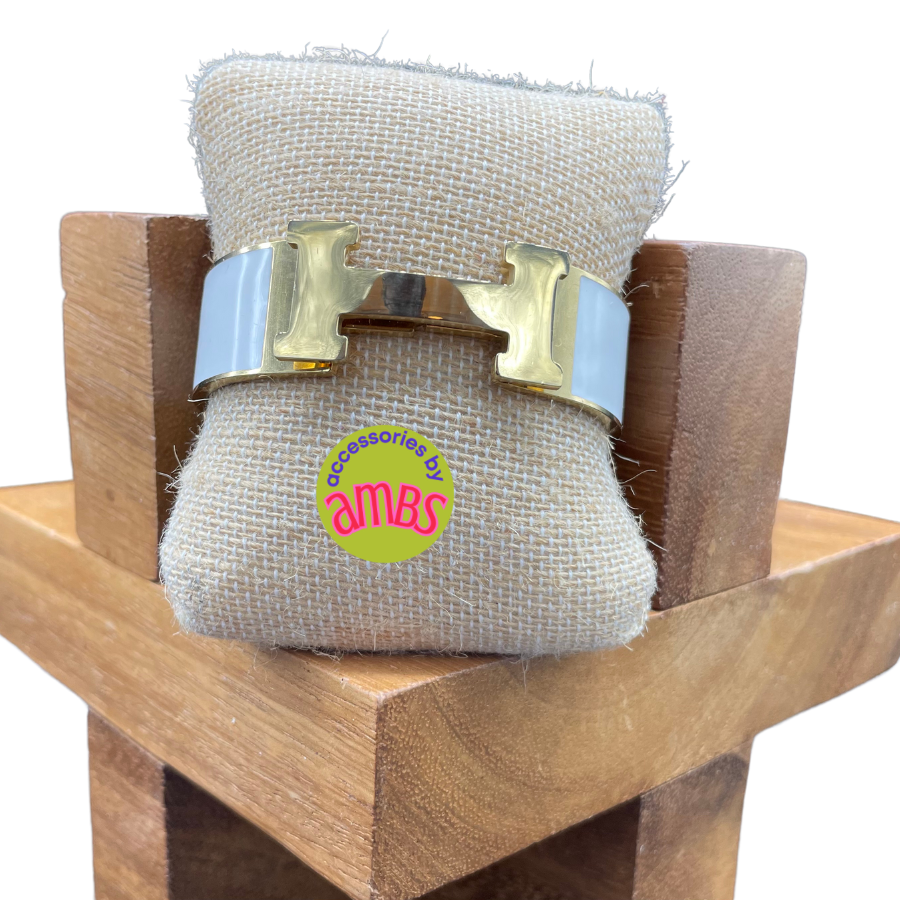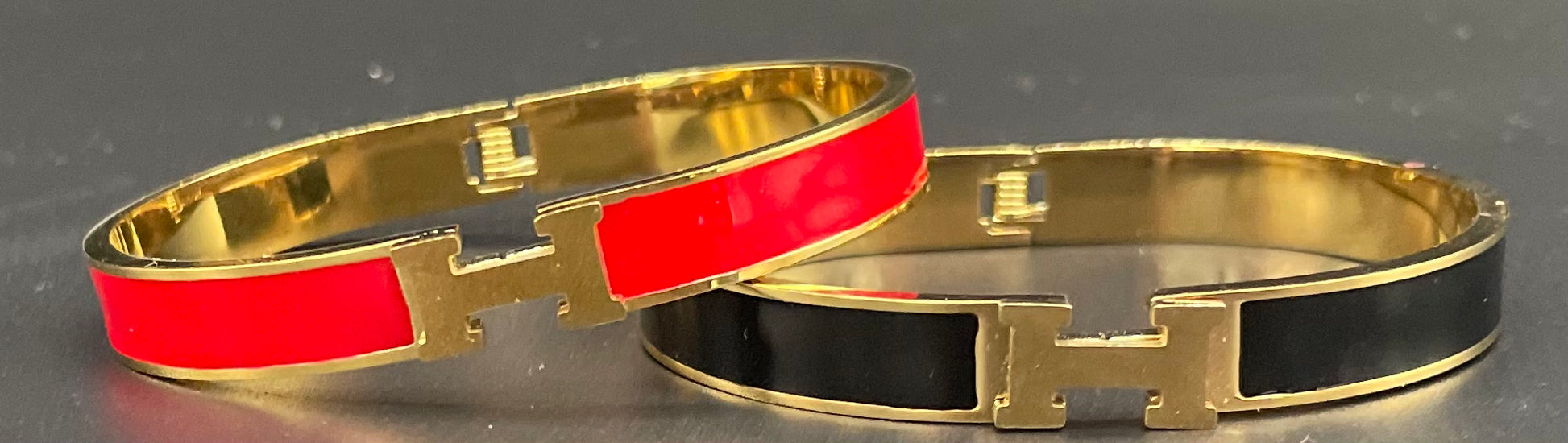 Introducing our designer-inspired Metal H Monogrammed Cuff. Make a classy statement with this cuff, available in red, white, and black with silver or gold monogram options. Step up your look with this classic piece.