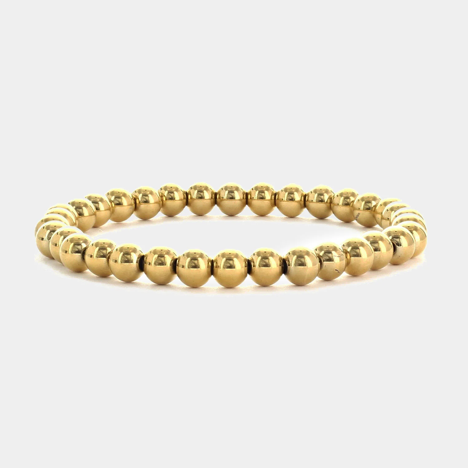 Elevate your wrist game with our OMG 6MM Gold Bracelet. Crafted from luxurious Triple Rhodium plated stainless steel, this simple stretch bracelet features delicate 4mm gold beads for a touch of elegant charm. Waterproof and versatile, it's perfect for stacking with your favorite bracelets and adding charms for a personalized touch.