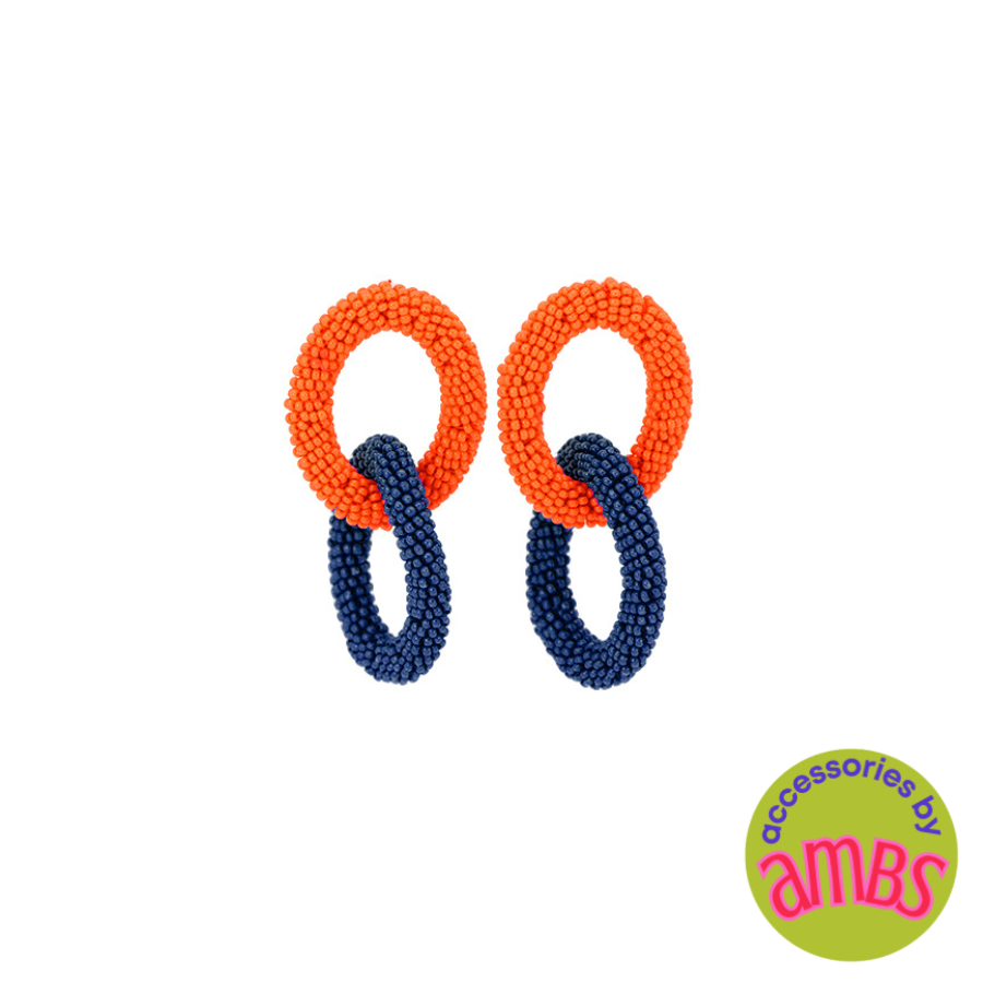 Raise your look with these sporty Orange and Navy Oval Linked Seed Bead Earrings. Classic and interlinked, they're perfect for the Tiger Tailgate or any game day! Touchdown in style with these eye-catching earrings.