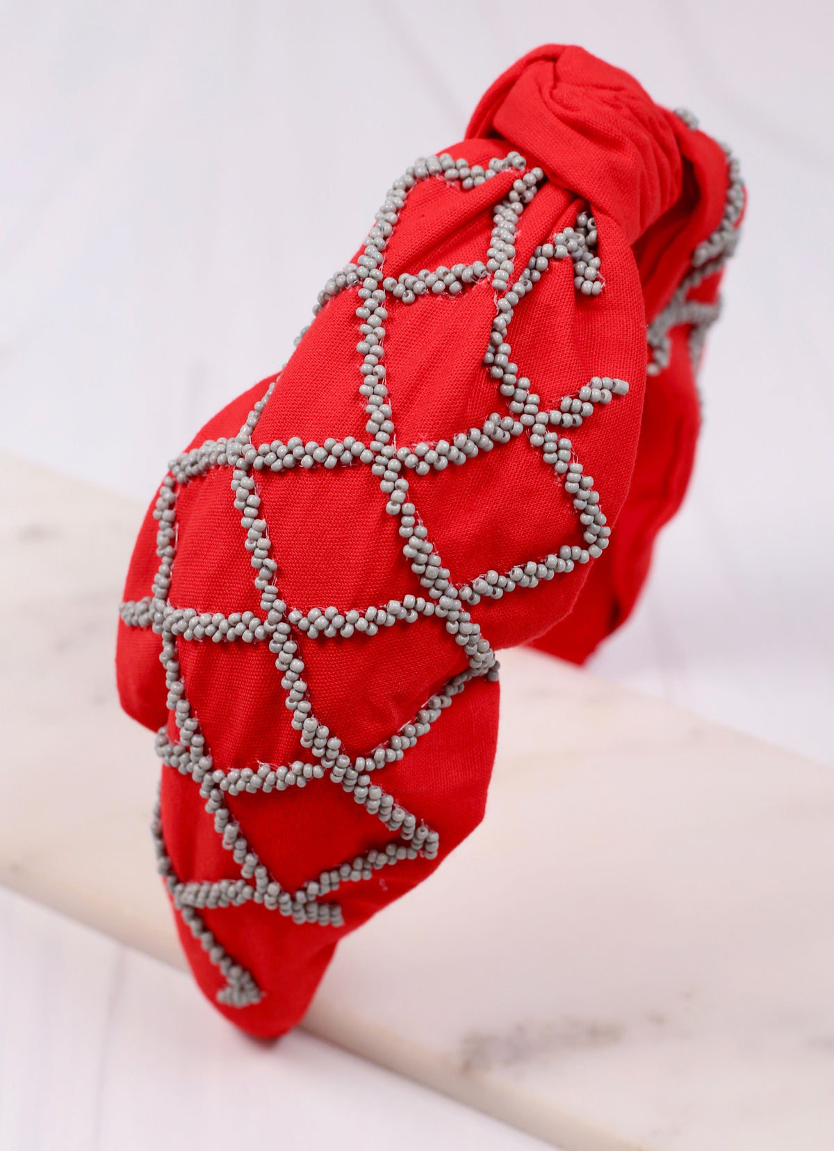 Show your team spirit with our Lattice Beaded Headband! Featuring a unique pattern in Red and Gray, it's the perfect accessory for game day to support our Hewitt Huskies.