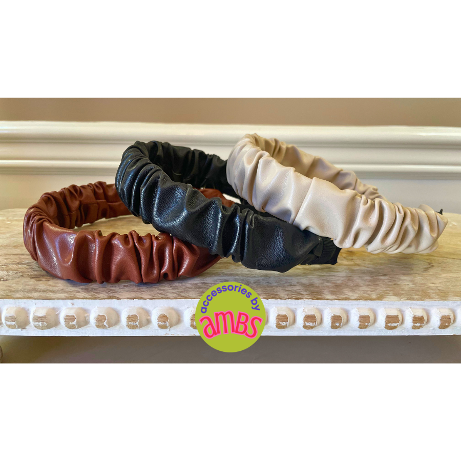 Get ready to scrunch in style with this vegan leather headband! Available in classic Beige, Cinnamon, and Black, it's perfect for all hair types. The medium width adds a touch of fashion to any outfit. Upgrade your hair game today!