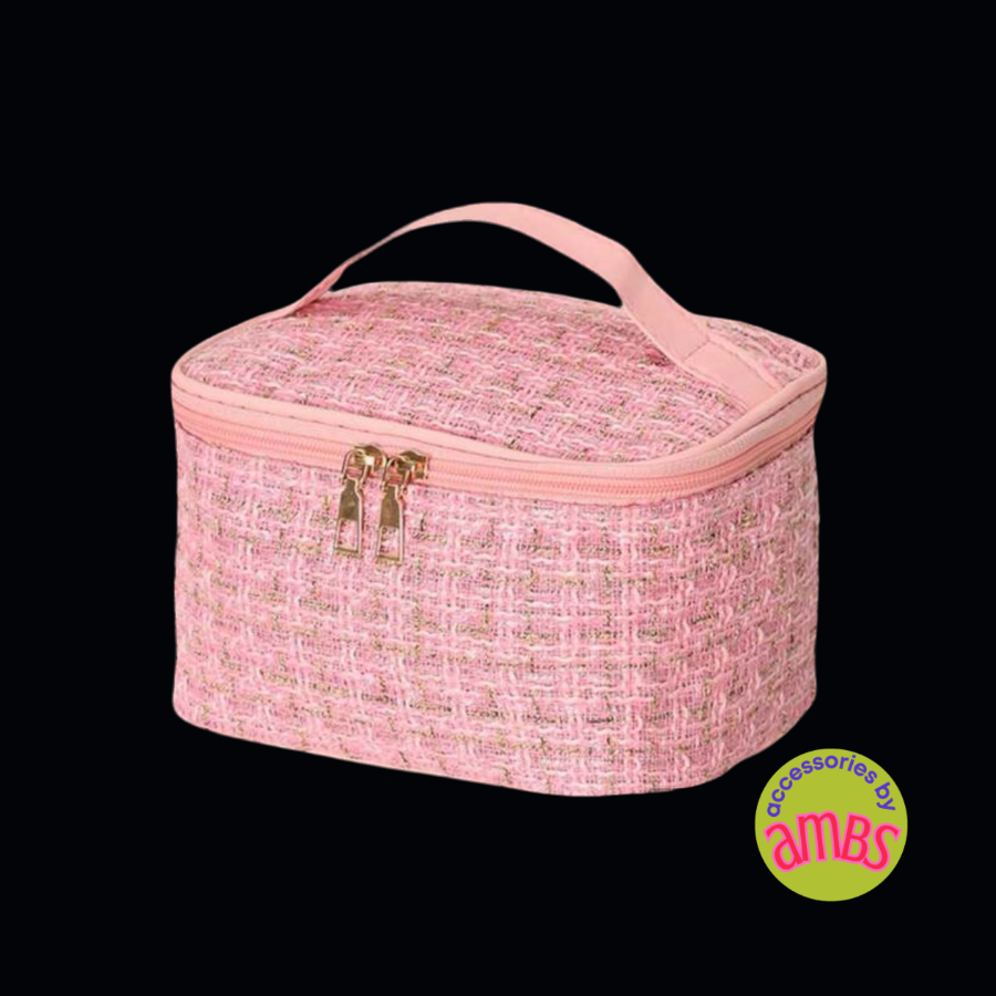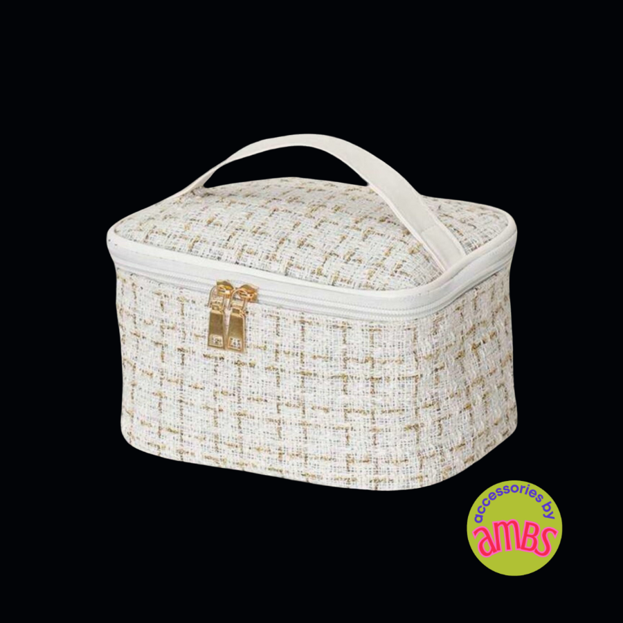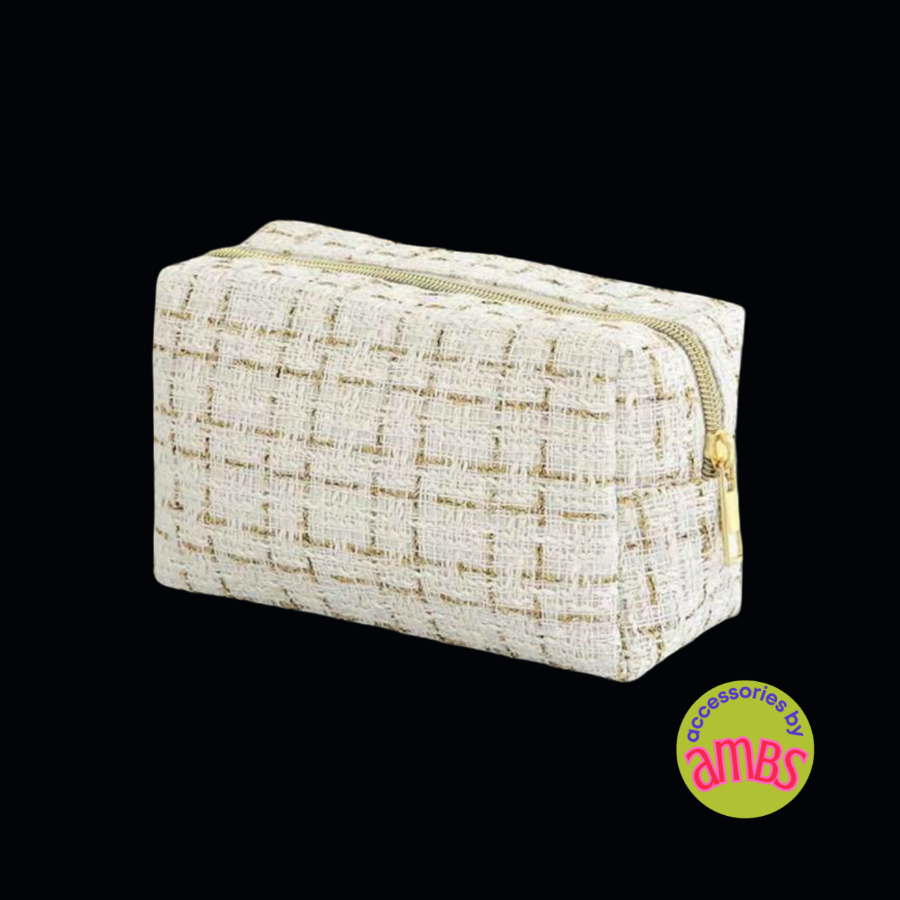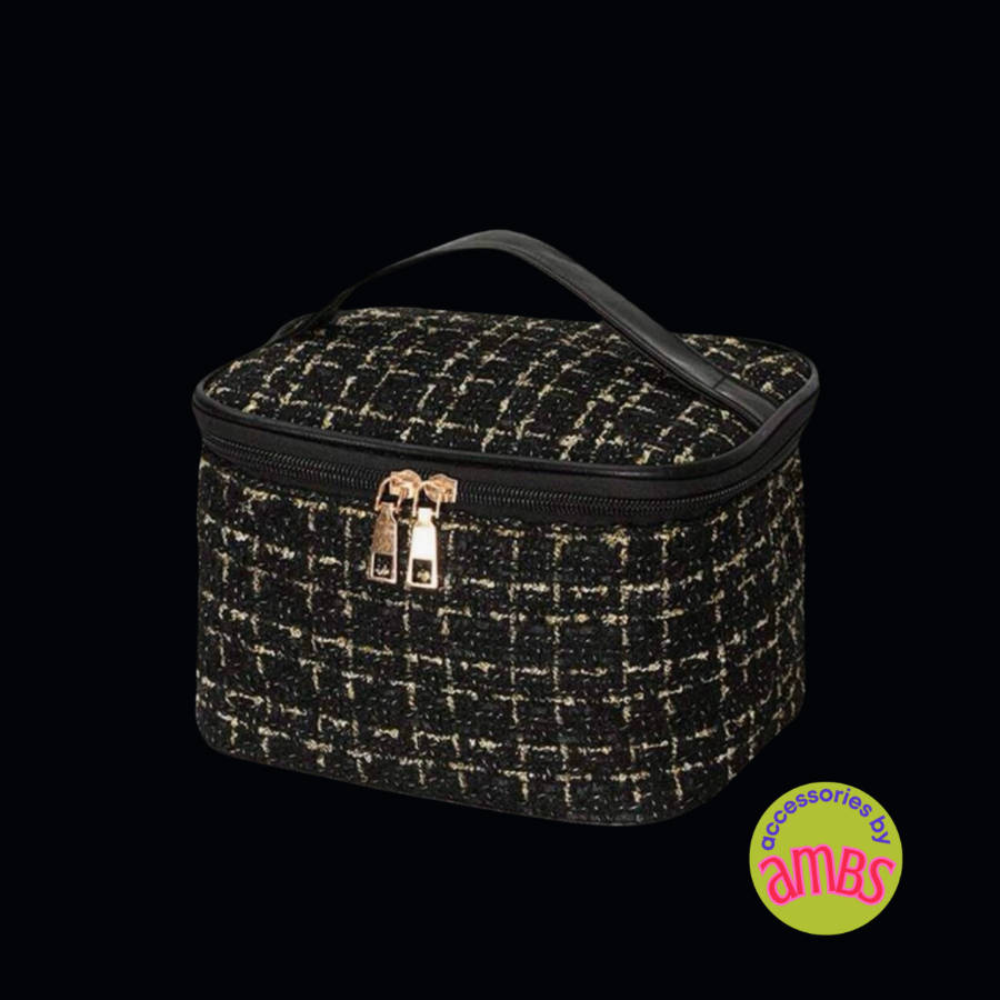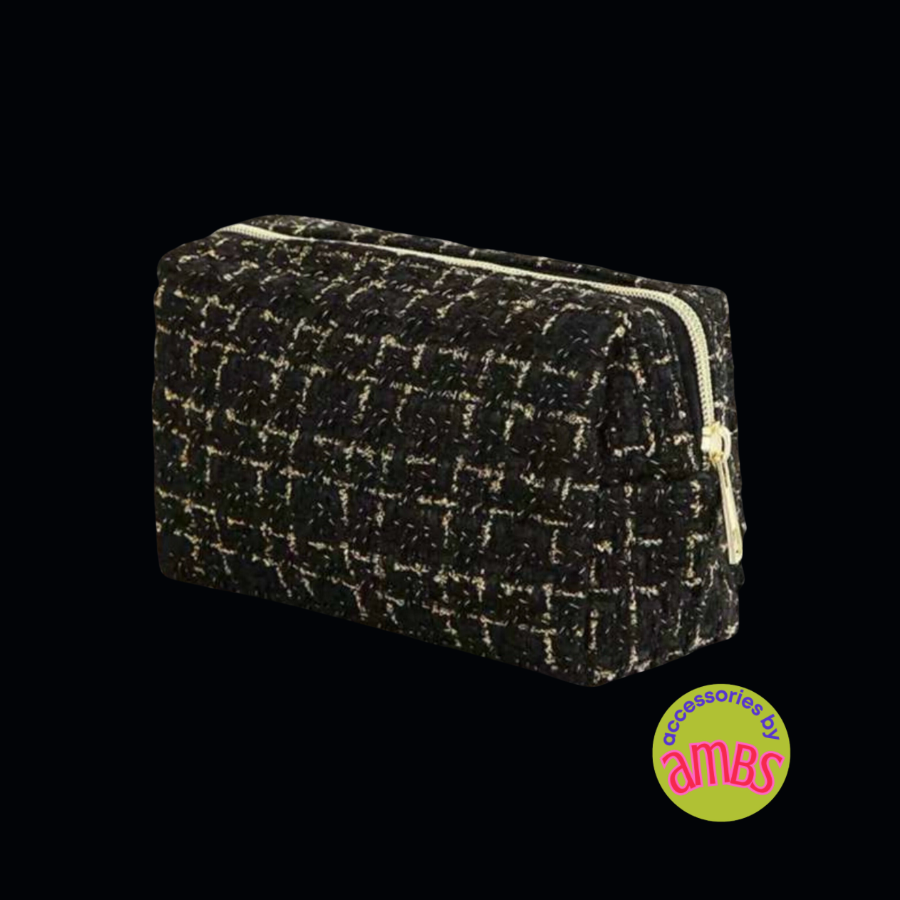 Indulge in luxury with our Tweed Travel Bags. Crafted in classic style, these bags are made from soft tweed fabric in three elegant colors - winter white, timeless black, and delicate pink - all adorned with gold detailing. Choose from two sizes - a travel case with handle and a cosmetic bag - perfect for all your travel needs. Make a sophisticated statement while on the go.