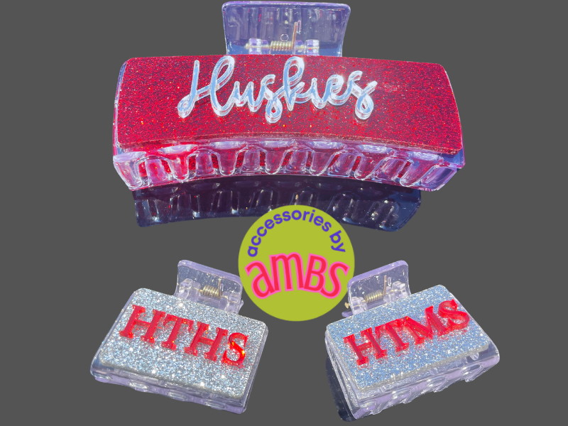 These glittery hair clips feature a red background with bold silver "Huskies" lettering, or you can choose a small silver glitter clip with red mirror HTHS or HTMS ! Perfect for making a statement and showing your school spirit. A must-have accessory for back to school season!